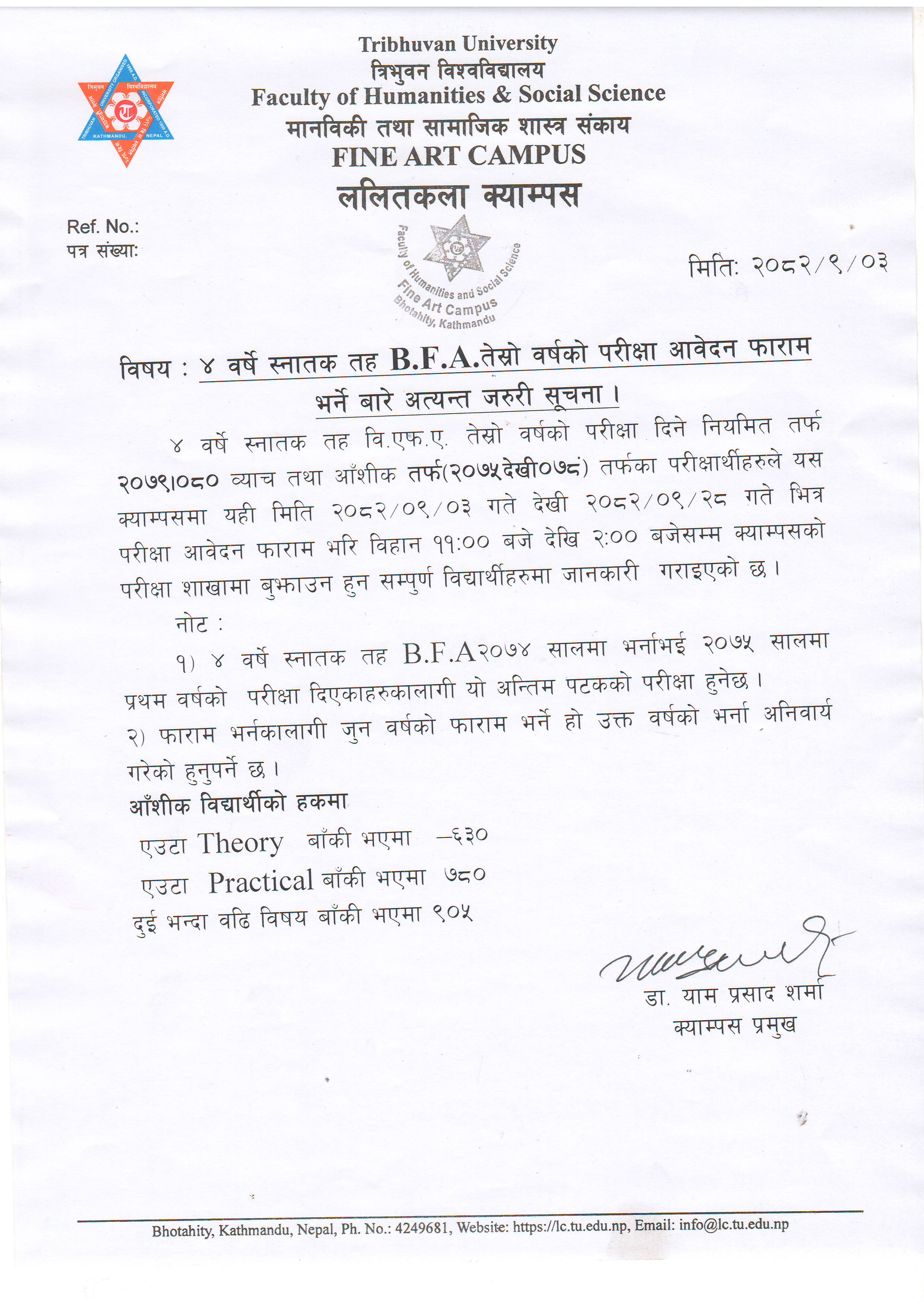 BFA तेस्राे वर्षकाे परीक्षा अावेदन फारम भर्ने बारे ।