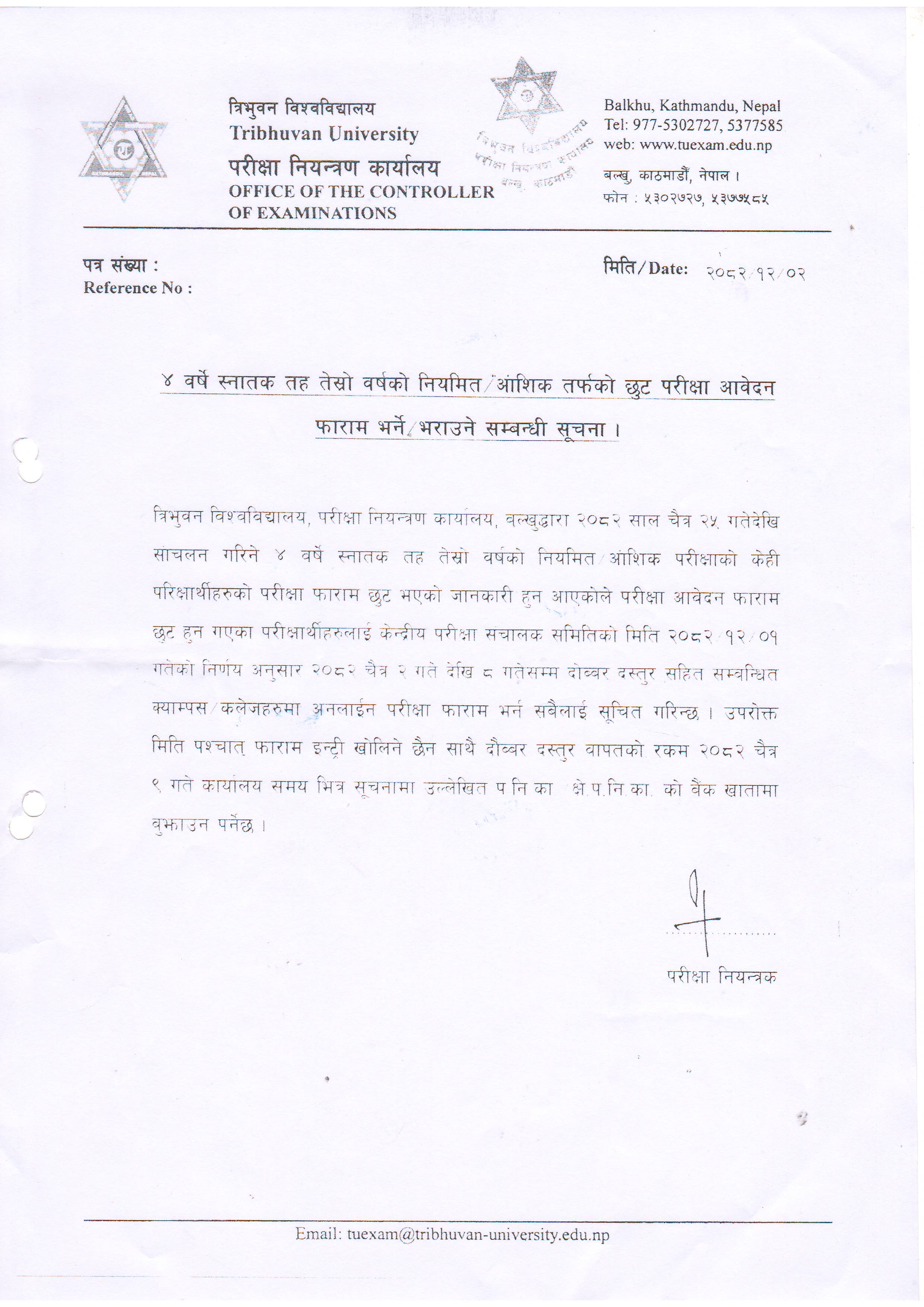 4th year BFA 1st Year Regular/Partial - 2083 काे परीक्षा फाराम भर्ने सम्बन्धी सूचना ।